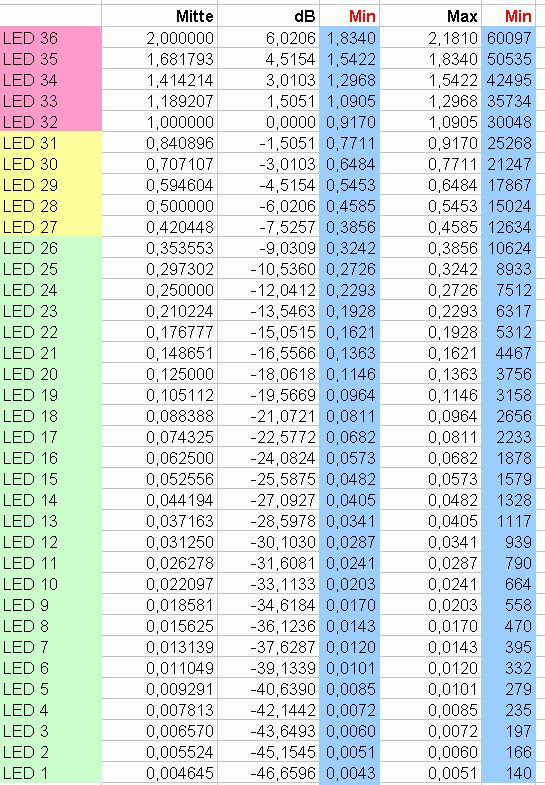 So zeigt die LED aber erst an, wenn der Wert überschritten ist. Eigentlich macht ma es aber doch so, dass jede LED ihren Bereich abdeckt. Daher leuchtet in einem 5er System z.B. die erste von 0 .. 20%, ide letzte von 80% bis 100%. Die Zentralpunkte liegen bei 10%, .... 90%. Es braucht also den oben erwähnten offset in der Tabelle.