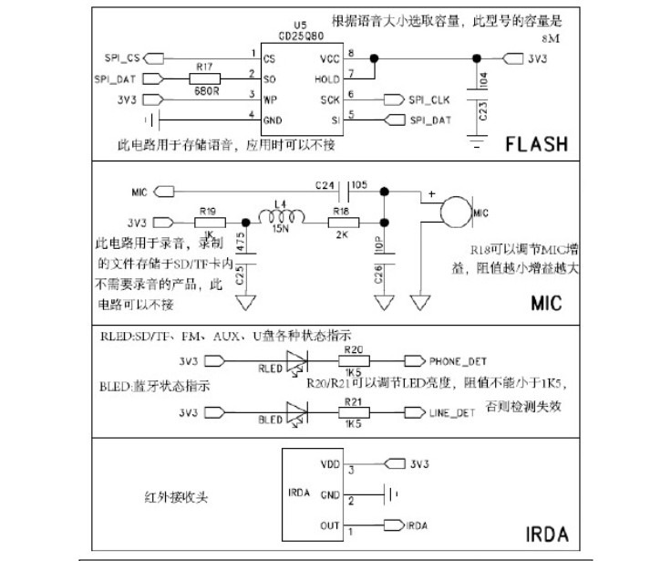Hatte gerade mal ein wenig Lust und habe weiter gesucht: Auf baidu.com (China-Google, falls nicht bekannt) habe ich mittels Suchbegriff "BLK-MD-SPK-E" Folgendes entdeckt: http://detail.1688.com/offer/36488483005.html Da sind eigentlich alle Anschaltungen aufgeführt! Der PWR_KEY geht also nicht gegen Masse sondern mit einem 100k gegen VBAT (sollte ein Li-Ion Akku sein, also für die ersten Versuche ca. 4V vom Netzteil). Alle weiteren Funktionen sind mit verschiedenen Tasten zugänglich, die alle zusammen mit einem binären Spannungsteiler an ADC_KEY gehen. Auch alle anderen Funktionen sind da zumindest per Bild beschrieben. FM Radio geht mittels Zusatz-IC QN8075, der mittels SPI vom Modul gesteuert wird. Die Schaltung, die Du schon verlinkt hast mit dem LN2054 ist halt eine Ladeschaltung für den Li-Ion Akku, mittels Power-Schalter wird Spannung auf VBAT und VPA gegeben. VPA wird zusätzlich über L1 entkoppelt. In der USB-Anschaltung findet man einen KX4002, dieser generiert 5V aus der Akku-Spannung für den USB-Stick. Ich denke, es werden einfach MP3s vom Stick gespielt. Siehe auch http://www.szkxw.com/data/20127301546581637.pdf Mittels der Bilder kann man auch Frage 1 klären: AUX-In wird aktiviert, wenn der Pin LINE_DET mit einem 1k gegen GND gezogen wird. SPK_L + SPK_R werden einerseits auf zwei Verstärker-ICs gegeben, weiterhin auf die Kopfhörer-Buchse. Die Kopfhörer-Buchse zieht im gesteckten Zustand PHONE_DET auf GND, damit dürften die Verstärker-ICs mittels MUTE ausgeschaltet werden. Die Anschaltung der SD-Karte dürfte auch klar sein. Das Mikrofon dürfte von Bedeutung sein, wenn bei aktiver BT-Verbindung vom Telefon ein Anruf eingeht. Viele BT Brüllwürfel können auch ein Gespräch annehmen. Alles in allem dürfte das ein Modul sein, dass in diesen typischen China-Brüllwürfeln verwendet wird. Jeder kleine Hersteller bekommt damit das Technologie-"Herzstück" geliefert und kann je nach Außenbeschaltung oder Bestückungsoption viele Produkte daraus schneidern (ohne viel Ahnung von Bluetooth etc. zu haben). Ich meine gelesen zu haben, dass die Firma Bolutek aus Shenzhen (immer eine Reise wert!!!) auch von diesem Modul der Urheber ist. Auf dessen Seiten konnte ich das aber nicht entdecken. Die Nomenklatur der Bezeichnung spricht aber dafür.