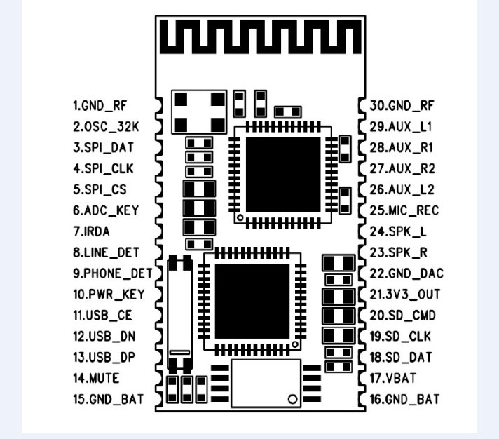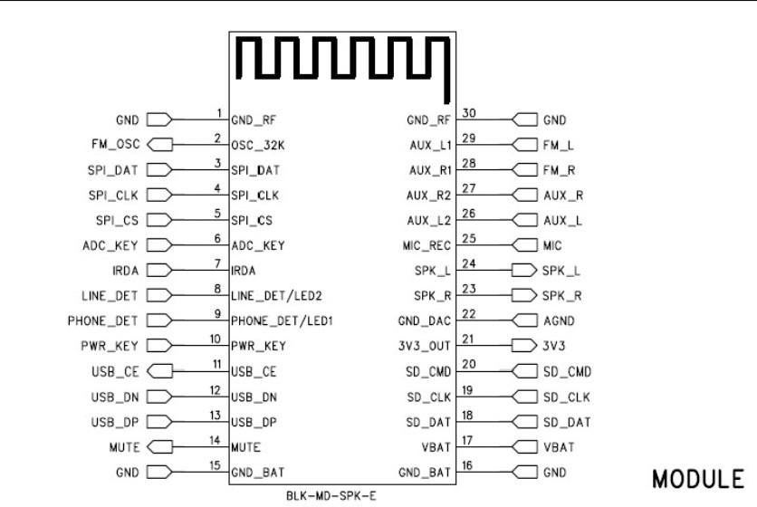 Hallo, ich bin neu in diesem Forum, deshalb verzeiht mir falls ich im falschen Unterforum poste. Ich habe eine Frage bezüglich der Ansteuerung des "BLK-MD-SPK-E" Bluetooth Moduls. Infos: http://imgs.inkfrog.com/pix/jelly0115/7_012.jpg http://imgs.inkfrog.com/pix/jelly0115/8_005.jpg http://www.ebay.de/itm/BLK-MD-SPK-E-Bluetooth-Audio-Module-Bluetooth-Module-Bluetooth-Speaker-Module-/201055265745 1. Frage: Wie kann ich Sound über AUX (Pin 26 & 27) durchschleifen bzw. zwischen Bluetooth und AUX umschalten? 2. Frage: Wie nutze ich den PWR_KEY auf Pin 10? Leider ich die Dokumentation im Internet (abgesehen von Pinbelegungen) recht schlecht, deswegen hoffe ich dass jemand hier bereits mit dem Modul Erfahrung hat. Vielen Dank im Voraus! EDIT: Vorsicht, es handelt sich um den BLK-MD-SPK-"E" und nicht den BLK-MD-SPK-"B" :-)