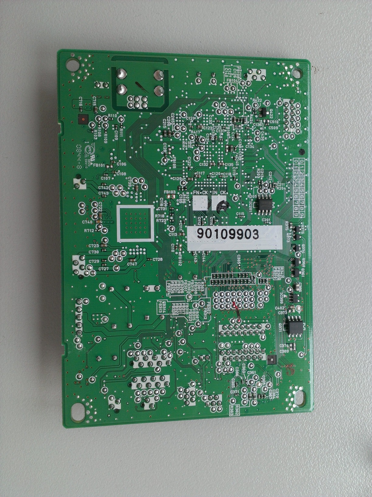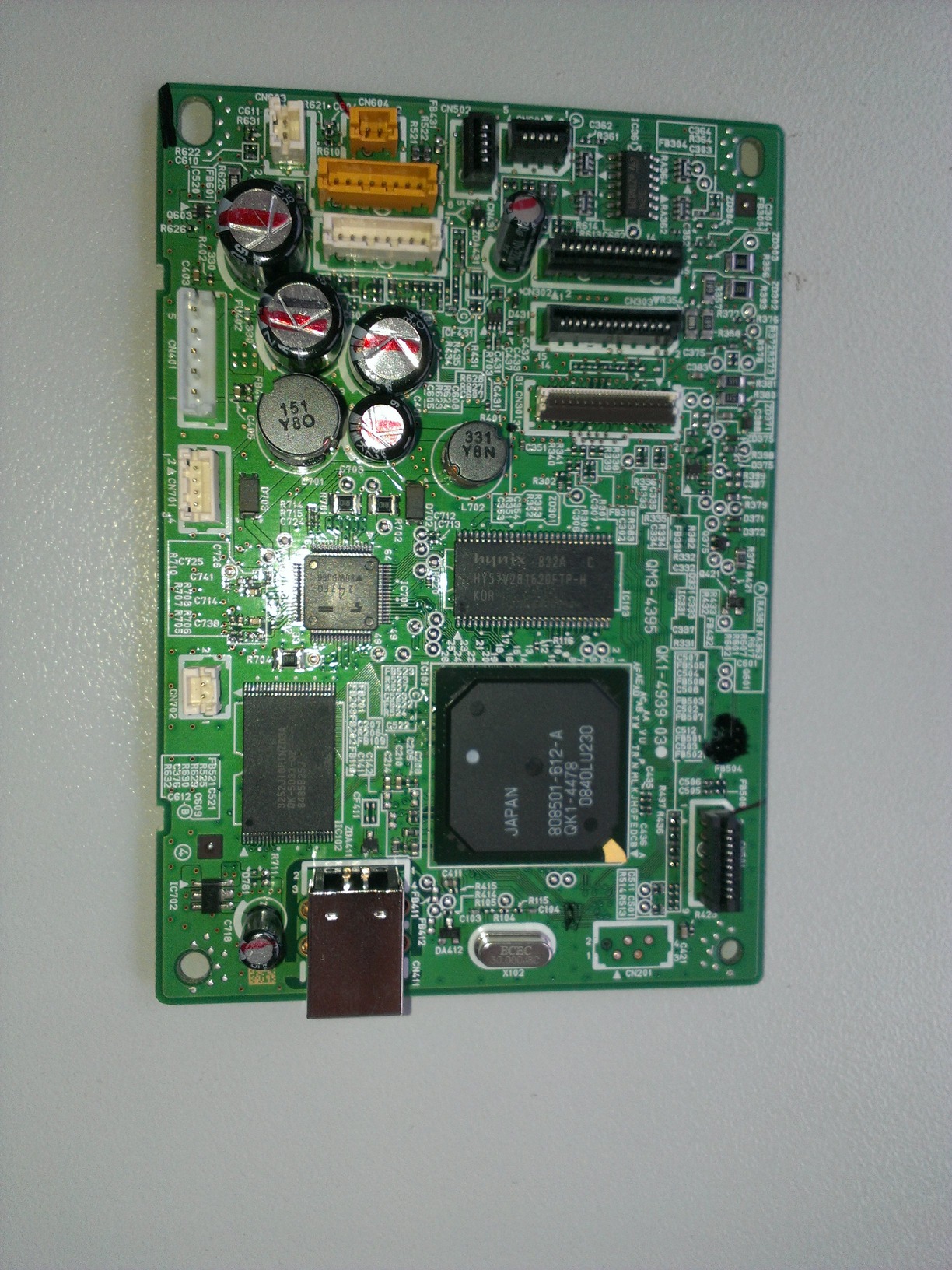 Er wird so heiß, dass ich mir den Finger verbrenne, wenn ich ihn ein paar Sekunden drauf halte. Sobald ich den Drucker einschalte leuchtet kurz die grüne LED auf, die den Eingeschaltet-Zustand anzeigt. Sie glimmt dann innerhalb von ca. 3 Sekunden aus. Die Hauptplatine vom Drucker wird mit 32V und 24V vom Netzteil versorgt. Da wird also sicherlich noch ein Regler auf IC-Spannung dabei sein. Es könnte also gut sein, dass es irgendwo einen Kurzschluss gibt, die IC-Spannung kurz da ist und die LED dann einen Kondensator leer saugt.