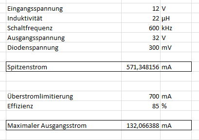 Hi Leute! Ich möchte gerne mit dem TPS61161 von TI das typische Application Example aufbauen, wie ich es hier auch angehangen habe. Einfach nachbauen ohne dabei etwas verstanden zu haben möchte ich jedoch nicht, daher habe ich vorab mal ein zwei Fragen - ich hoffe, mir kann jemand hierbei helfen. Meine Spannungsquelle liegt zwischen 4V (4 nahezu entladene 1,2V AA-Akkus) bis 12V (alternatives Steckernetzteil) - in diesem Bereich soll die Schaltung mir 10 weiße LEDs erleuchten. Jetzt habe ich mich mal an die Berechnungsformeln gemacht und das in Excel eingebeben, damit ich ein bisschen mit den Werten herumspielen kann. Das habe ich jetzt mal für 4V und für 12V gemacht. Ist es korrekt, dass bei einer höheren Spannung der Peakstrom in der Spule wesentlich höher ist, als bei einer niedrigen Spannung? Ich dachte, dass der Wandler, um auf die Ausgangsleistung zu kommen, bei einer höheren Eingangsspannung weniger Strom braucht, da die Leistung ja eigentlich gleich bleibt, also mehr Spannung, weniger Strom und umgekehrt. Hintergrund des ganzen ist, dass ich einen Schalter zum Ein-/Ausschalten einbauen will und ich den ja auch danach dimensionieren muss und der mir nicht abraucht. Ich hatte einen schönen herausgesucht, der bis 0,5A spezifiziert ist, aber bei 12V fließt in die Spule ja scheinbar schon ein Strom von über 500mA. Bei 4V Eingangsspannung würde es gehen. Wo ist mein Denkfehler? Gruß und danke