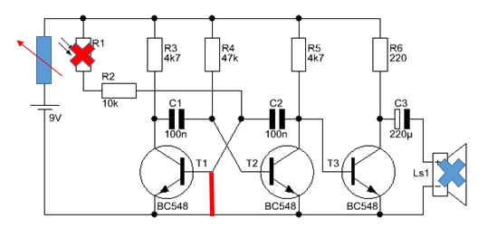 EDIT: In der ersten Schaltung urde der LDR verschoben und durch eine Leiterbahn ersetzt. Verschoben wurde er an die Basis von T1 und Emitter (Roter Strich). Ein POTI habe ich auch hinzugefügt um verschiedene Tonlagen zu erreichen. In der zweiten Schaltung dem Verstärker habe ich 4x 26R1 Widerstände zu je 2 parallelgeschaltet an die Emitter der Transistoren welche bei mir der BD136 (unten) und BD135 (oben) ist. Der andere Transistor ist ein nor.aler BC337. Diese Widerstände dämpfen die Höhen & Tiefen denke ich mal. Man erlangt ein saubereres Klangbild mit weniger rauschen?