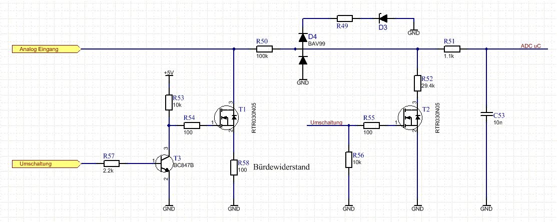 Weiterhin: Mache doch einen festen (nicht geschalteten) Spannungsteiler-Widerstand parallel zu R52, z.B. für einen Eingangsbereich 5V. Wenn die Umschaltung des Teilers jetzt noch unabhängig von der Bürde wird gewinnst Du einen Bereich. Allerdings würde sich die Auflösung für die Strommessung entsprechend verschlechtern.