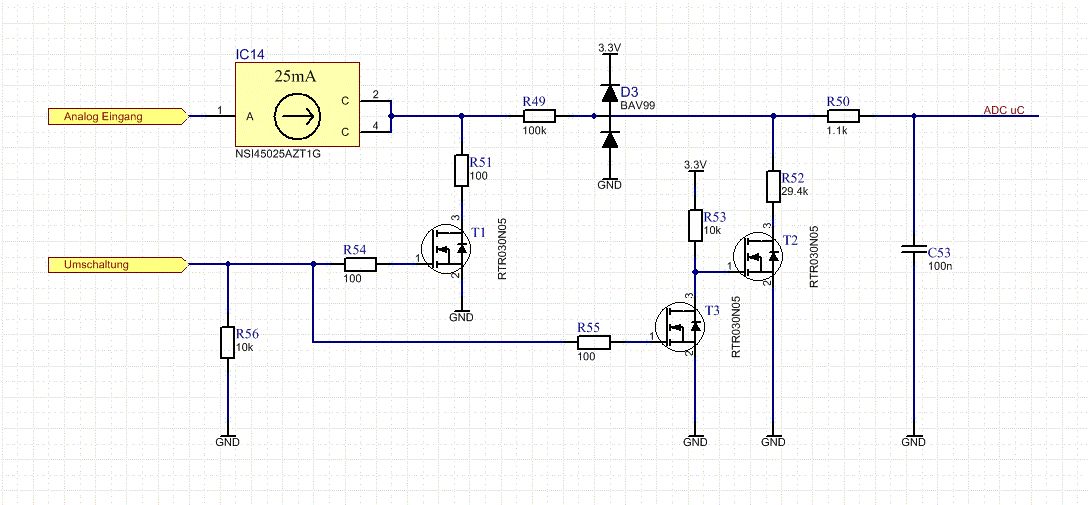 Den NSI45025 hast Du wohl zur Strombegrenzung - nehme ich an. Der versaut Dir bei der Spannungsmessung aber evtl. die Linearität. Alternative wäre, den 100R beim MOSFET auf die Sourceseite zu verlegen. Dann schnürt bei zu hohem Strom die fallende Gate-Source Spannung den MOSFET ab und schützt damit den Bürdenwiderstand. Voraussetzung ist allerdings ein genügend hohe Gate-Spannung zum Umschalten, damit der MOSFET entsprechend niederohmig im Normalfall bleibt. 5V zur Ansteuerung sollten reichen. Den 100k am Eingang hast evtl. so hochohmig gewählt, damit bei zu hoher Eingangsspannung die obere Diode gegen 3.3V die Versorgung nicht abhebt - richtig? Vorschlag: hänge die obere Hälfte der Doppeldiode D3 nicht gegen 3.3V sondern gegen eine 3.1V Z-Diode. Diese Z-Diode wird mit einem Vorwiderstand gegen z.B. 5V im Arbeitspunkt voreingestellt. Kommt es jetzt zu einer Überspannung am Eingang wird der Strom über die Z-Diode abgeleitet und nicht gegen die 3.3V Hauptversorgung. Wenn so getan kann man den 100k deutlich kleiner gestalten. Bei x Eingängen die Z-Diode entsprechend auslegen.