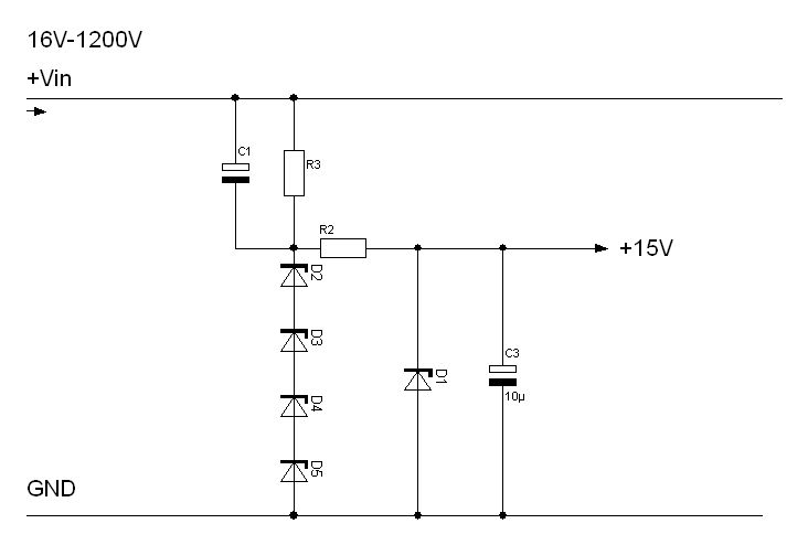 Könnte man mit nem Spannungsfolger und nem 1200V-Mosfet machen. Da dürften die 15V schon ab etwa 17V Eingangsspannung zur Verfügung stehen. Verbraucht auch sehr wenig Ruhestrom, müsstest dazu aber ne micropower-Referenz nutzen, nicht nur wie üblich ne Z-Diode.