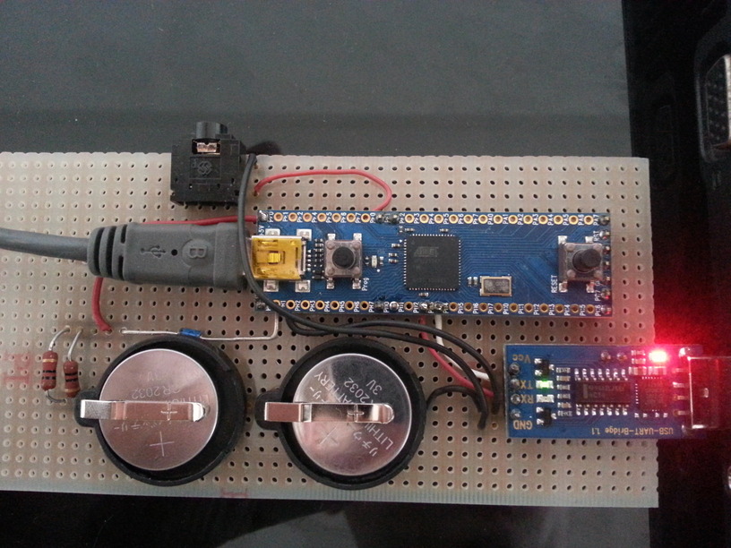 Bilder erklären manchmal mehr als Worte: Das Flimmernde Lämpchen, das ich meine, ist auf dem Bild gelb. Das TX auf der USB-UART-Brücke ist eigentlich RX. Das hat der Hersteller nur vertauscht. Das andere Ende des Kabels, das auf dem Foto nicht zu sehen ist, steckt am USB-Slot des PC. Aus deinem bildhaften Postin bin ich leider nicht slau geworden. Die Kommunikation zwischen dem PC und dem uC soll über die USB-UART-Brücke erfolgen und nicht über das Kabel. Das ist nur zum Flashen da. Oder wie sonst soll ich dich verstehen Julian