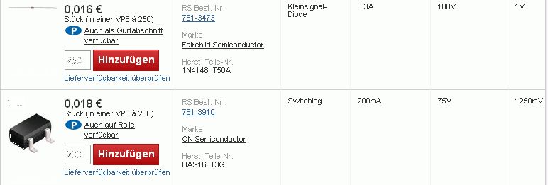 Ja, doch schrieb: > Wenn es denn nur um den Preis geht - verdammt nah dran: Er meinte ja "Einzelstück, inkl. Versand"... In Größeren Mengen ist es kein Problem, unter 1 cent zu kommen... Aber was will ich mit 25000 1N4148? Ansonsten: http://www.pollin.de/shop/dt/MTQ2OTkxOTk- http://www.pollin.de/shop/dt/MDk5OTkxOTk- :)