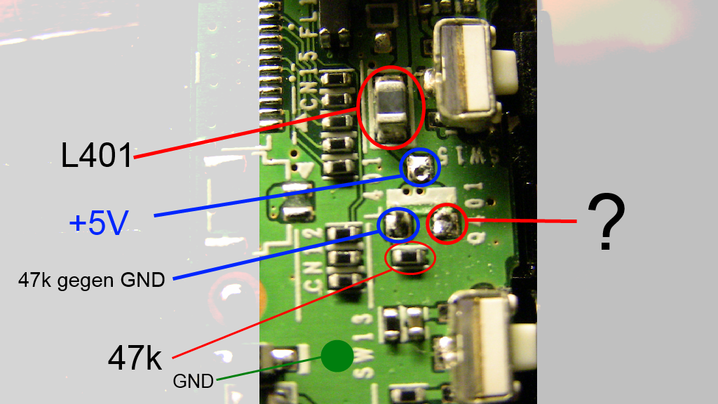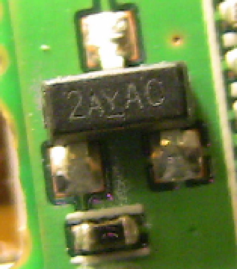 Hallo nochmal, Da ich immer noch keine Informationen zu dem Transistor gefunden habe, habe ich mal ein paar Messungen gemacht und die Aufschrift der umliegenden Transistoren mit der des Q401 verglichen. Ich würde die Aufschrift nun als "LA Y DP" interpretieren. Als nächsten Schritt habe ich auf diesen Seiten nach dem SMD-Code gesucht, bin aber nicht fündig geworden: http://www.griederbauteile.ch/download/Tabellen/SMD_Code_Catalog.pdf http://www.marsport.org.uk/smd/mainframe.htm Kurz zu den Messungen: An dem Pin unterhalb L401 liegt die Versorgungsspannung von 5V gegen GND an. Der Pin links unten hat einen Widerstand von 47k nach GND. Eventuell ein Pull-down Widerstand? Der als Fragezeichen markierte Pin hat einen Widerstand von 2,4k gegen GND und 86k gegen Batt+. Ich frage mich immer noch wie sich ein SOT-23 Package mit 2 abgebrochenen Pins einfach so von der Platine löst und einen Defekt verursacht...
