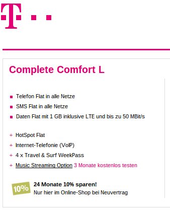 magic smoke schrieb: > Es ist > auch nicht meine Aufgabe, da eine Lösung zu finden. Wie gut, dass die Telekom das schon gemacht hat, und eine Lösung (nicht nur) für dich gefunden hat: http://www.t-mobile.de/tarifoptionen/0,20406,17775-_3315,00.html Musst dich halt daran gewöhnen, für das zu Bezahlen, was du benutzt... Wenn du dich aber nur am Wort "Flatrate" in der Tarifbeschreibung störst, wird die Lösung höchstwarscheinlich von der Marketing-Abteilung der Telekom kommen, und der Tarif-Bestandteil wird einfach umbenannt.