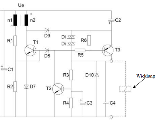 Hallo Zusammen, ich habe eine Frage und zwar: Wenn die Ansprechspannung dieser Bauelemente erreicht ist, schaltet der Transistor T3 durch und der Kondensator wird über die Wicklung der Magnetspule entladen. Sobald der Transistor T3 leitfähig ist, erhält die Basis des Transistors T2 über den Spannungsteiler R3 und R4 Strom und der Transistor T2 wird leitfähig. Dies bewirkt dass der Transistor T3 auch leitfähig bleibt, wenn der Kondensator C2 so weit entladen ist, dass die Wicklung nur noch Strom aus dem eigensicheren Stromkreis erhält. Solange der Transistor T2 leitfähig ist, sperrt der Transistor T1. Meine Frage wenn ich eine Spannung am Eingang anlege, was passiert mit dem Transistor T1 bevor C2 auflädt (was schaltet T1 durch). was begrenzen die Di (Diacs)? Gruss