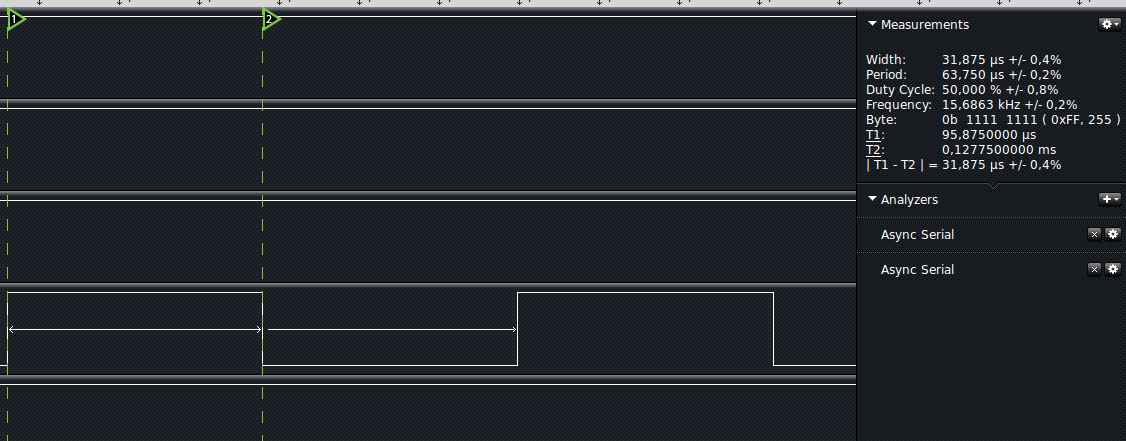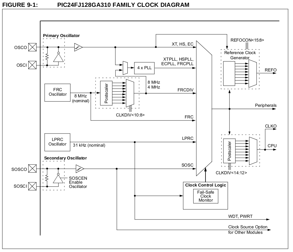 Ich habe einen PIC24FJ128GA3006, es läuft der interne FRC und ich lasse mir über den REFO Pin den System Takt/512 ausgeben. Frage: Wie kann ich mit dem Angehangenen Bild erkennen mit Welcher Frequenz die Interne FRC schwingt? f= 1/ 63,75µs ? REFOCONbits.RODIV = 0b1001; // 1001 = Base clock value divided by 512 REFOCONbits.ROEN = 1; // 1=Allow Clockouput on REFO Pin REFOCONbits.ROSEL = 0; // 0=System clock is used as the base clock