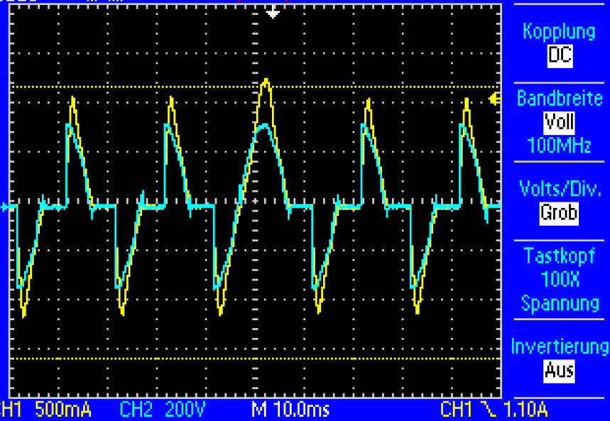 Hatte einen Widerstand am Gate zu Tp76 drin, hat aber nix gebracht. Weder niederohmig mit 470R noch hochohmig mit 47k. Wie könnte man forcieren, dass der Haltestrom unterschritten wird? Passiert das nicht auf jeden Fall im Nulldurchgang. Müsste sich sogar umdrehen, oder?