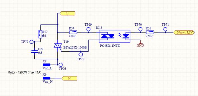 Snubberless heisst nicht integriert, sondern dass er im dritten Quadranten nicht zündet. Interessiert in deinem Fall nicht. Durch Strom und Spannungsverschiebung deines induktiven Motors liegt die Spannung im Stromnulldurchgang schon über ca. 16V. Angenommen die LED ist schon aus, dann sprint die Spannung beim Abscgalten von 1.4V auf 16V und überschreitet dU/dt. Dagegen hilft ein Snubber. Michael schrieb: > Der Snubber ist garnicht bestückt. Warum erfährt man so was zum Schluss? Scheiss Veralberungstaktik.