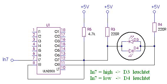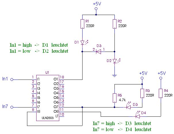 Hallo, im Bild siehst du 2 Varianten, wie man das machen kann. Die obere geht so, wie du es schreibst. Bei der der unteren werden 2 Gatter des ULN2803 benutzt um die Nagation zu realsieren. Gruß Öletronika