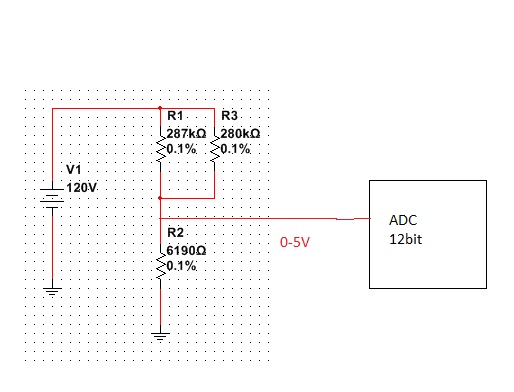 Die beiden Widerstände R1 und R3 würde ich durch eine Reihenschaltung ersetzen, weil die 120V, die da anliegen, schon aus Sicherheitsbetrachtungen nicht mehr ganz unkritisch sind (Abstände, Schutz im Fehlerfall). Die Einzelwerte sind dann nur noch im Bereich von 70kΩ, wodurch die Fehler durch Verschmutzung und Feuchte weniger wirken. Bedenke auch, dass die angegebenen Widerstandstoleranzen nur die Auslieferungstoleranzen sind und dazu noch Temperaturgang, Alterung, Änderung durch den Lötvorgang und weitere Einflüsse kommen. Die Gesamttoleranz über Alles kann dann leicht das fünf- bis zehnfache betragen.