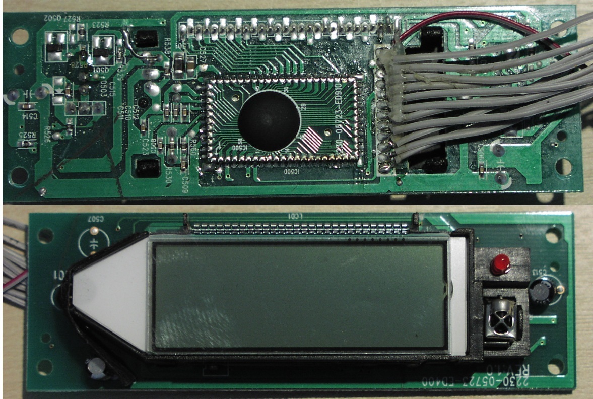 Hallo, Ich habe von jemandem aus unserer Funker-Judendgruppe dieses LCD-Display bekommen. Er fragete ob man es mittels Mikrocontroller ansteuern kann. Ich würde es nun gerne ansteuern und dann die nächten male mal vorführen. Problem ist jedoch dass ich keine Infos dazu finde. Auf der Vorserseite der Platine steht: 2230-05723-ED400 Rev: 1.0 Auf der Controllerplatine (Auf Rücksteie aufgelötet.) auf der Rückseite: 230-05723-ED910 Es hat 12 Leitungen, ist beleuchtet, und hat eine LED (Rot), sowie eine IR Sender/Empfänger-Diode (3Polig). Das Display ist über 28Pins mit dem Controller verdunden. Grüße Matze