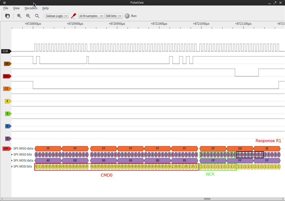 Hi, ich versuche nun zum ersten mal eine SD Karte über SPI anzusteuern. Ich sende CMD0 und die Karte antwortet auch. Allerdings tut sie das nach Spezifikation (SanDisk) zu spät. Im Bild sieht man, dass NCR 11 Takte lang ist. In der Spezifikation steht aber, dass NCR min. 1 und max. 8 lang ist. Verstößt meine SD Karte von HAMA nun gegen die allgemeine SD Spezifikation oder die SanDisk Spezifikation oder mache ich etwas falsch? Bei Takten ist schon der SPI Takt gemeint? Ansonsten macht sie alles korrekt. SPI ist mit 250 kHz getaktet. Vielen Dank im Voraus