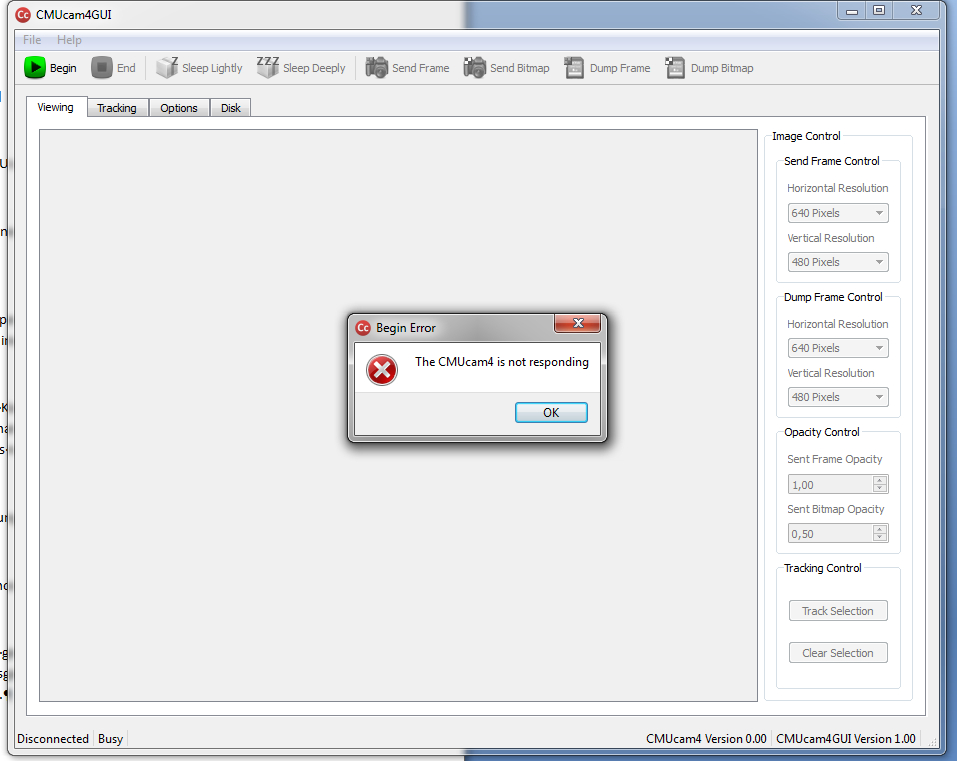 Hallo! Ich hab Probleme mit dem GUI der CMUcam4. Das einzige was funtioniert ist, mir einen Frame mit 80x60 Pixeln anzeigen lassen, was allerdings schon ungefähr eine Minute dauert, bis was am Monitor erscheint. Bei höheren Auflösungen blinkt die rote LED kurzzeitig und dann erscheint die Meldung "CMUcam4 is not responding" Hat hier vielleicht jemand eine Ahnung wo die Ursache dafür liegt und wie dieses Problem zu beheben ist? MfG Alex