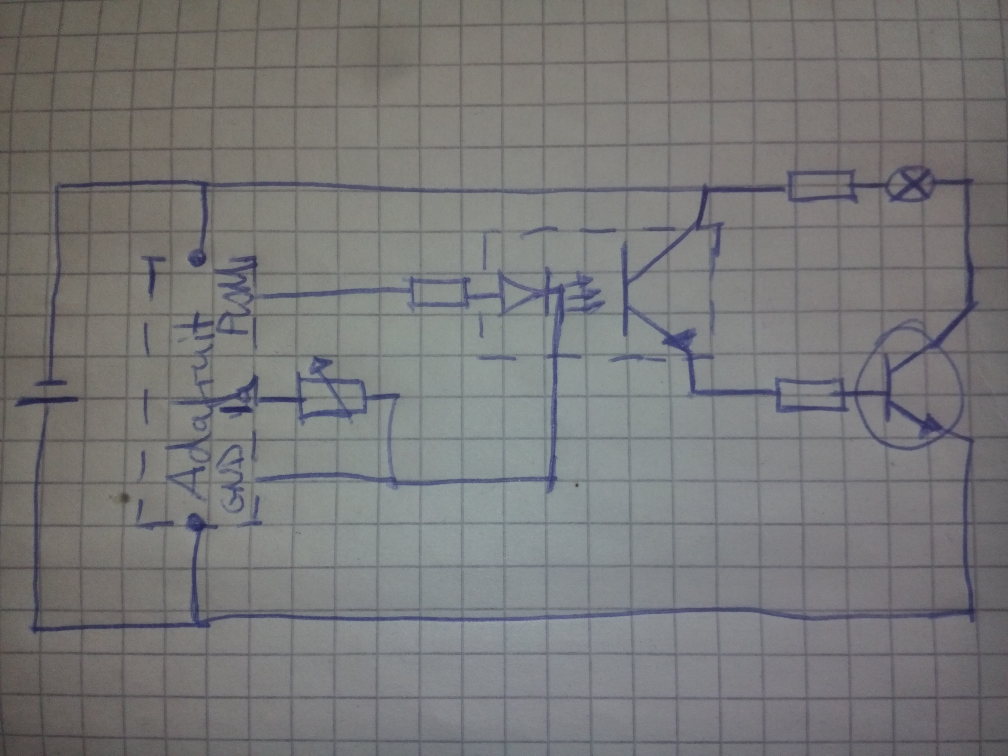 Den Optokoppler hatte ich eingebaut, da der Adafruit mit 3.3V läuft (hat einen eingebauten 3V Regulator) und dachte, dass ich eine physikalische Trennung zwischen den 3.3V (am PWM Ausgang) für den Adafruit und den 5V für den Rest sinnvoll wäre.