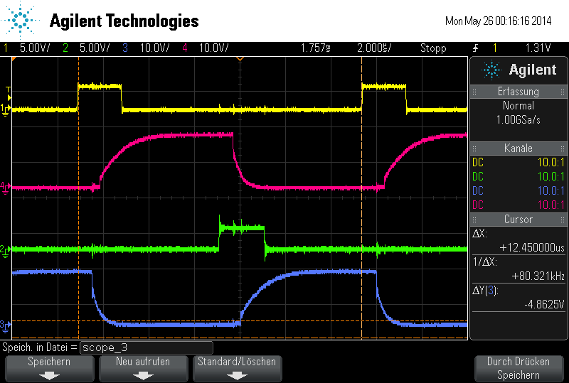 Hallo, vorweg: ich bin neu hier :) Ich soll an einer H-Brücke für einen DC/DC Wandler weiter bauen, bzw die Regelung programmieren. Meines Wissens nach hat die Schaltung schon funktioniert, aber ich bekomme sie nicht zum laufen. Mit einem XMC4500 generiere ich ein 2pahsiges PWM Signal mit variablem Dutycycle für den Infineon 6ED003L02-F2 Treiber. Die Steuerausgänge für die Mosfets am Treiber werden aber unabhängig vom Dutycycle abwechselnd mit der halben Schaltperiode durchgeschaltet. Warum? Anbei ein Bild mit den beiden µC Ansteuersignalen (1&2) und den Spannungen am Treiberausgang ( 4&3, leider Dutycycle unabhängig). Ich habe keine Ahung, was das Problem ist: Treiber kaputt? (hab auch schon nen neuen probiert), Spannungsversorgung zu gering?, doch ein Problem in der Schaltung, in der der Treiber integriert ist? Danke im voraus für Hilfe Gruß Florian