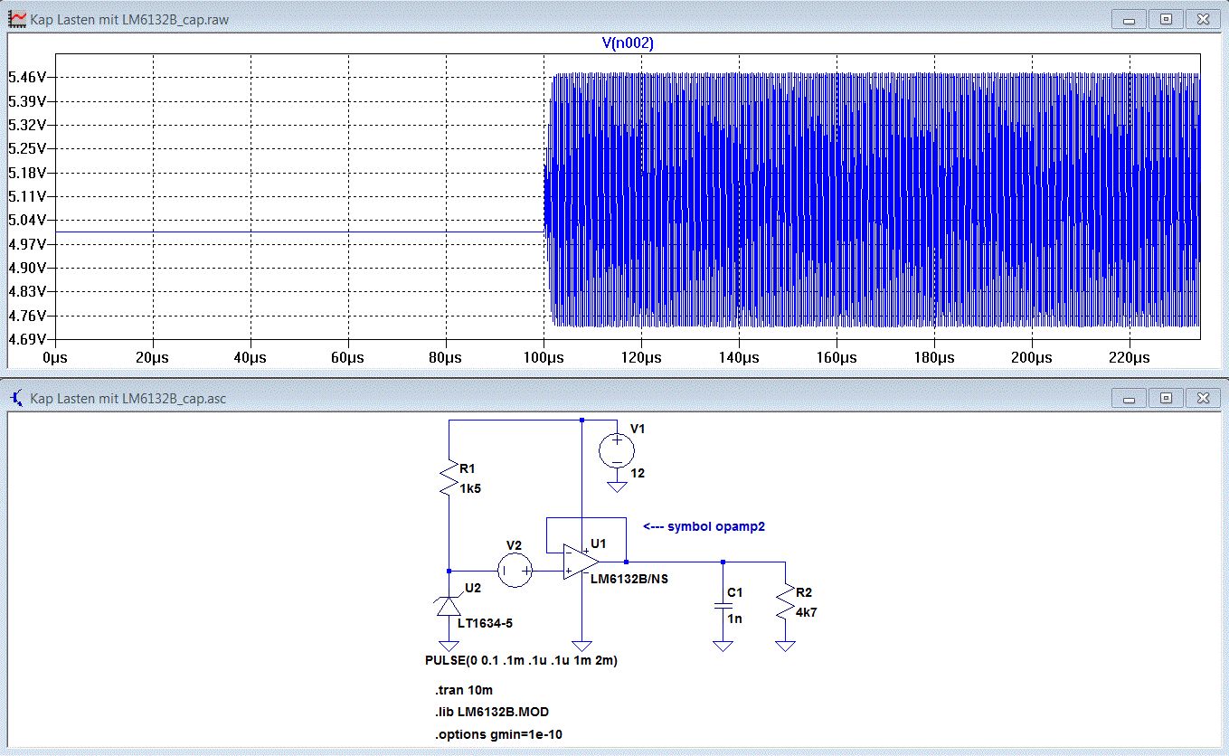 Besten Dank jetzt funktioniert das Modell. Ziel der Simulation ist zu sehen, ab wann der OpAmp auf Grund der kapazitiven Last instabil wird. Ich finde es allerdings seltsam, dass dies unabhängig von meiner Last nie der Fall ist. Woran kann das liegen? Auch wenn ich den Lastwiderstand entferne und nur die Ausgangskapazität am Ausgang des OpAmps angeschlossen ist, ist die Ausgangsspannung am OpAmp bockstabil. Gruss Markus