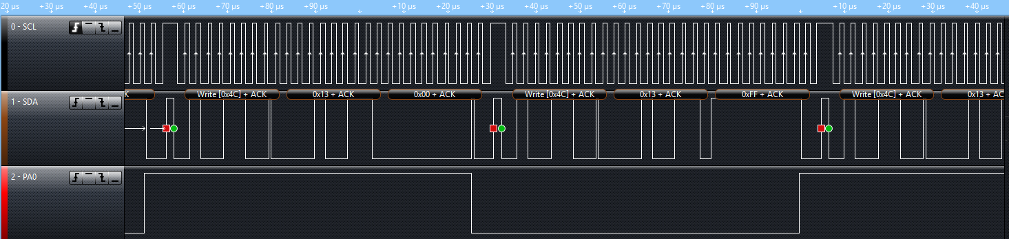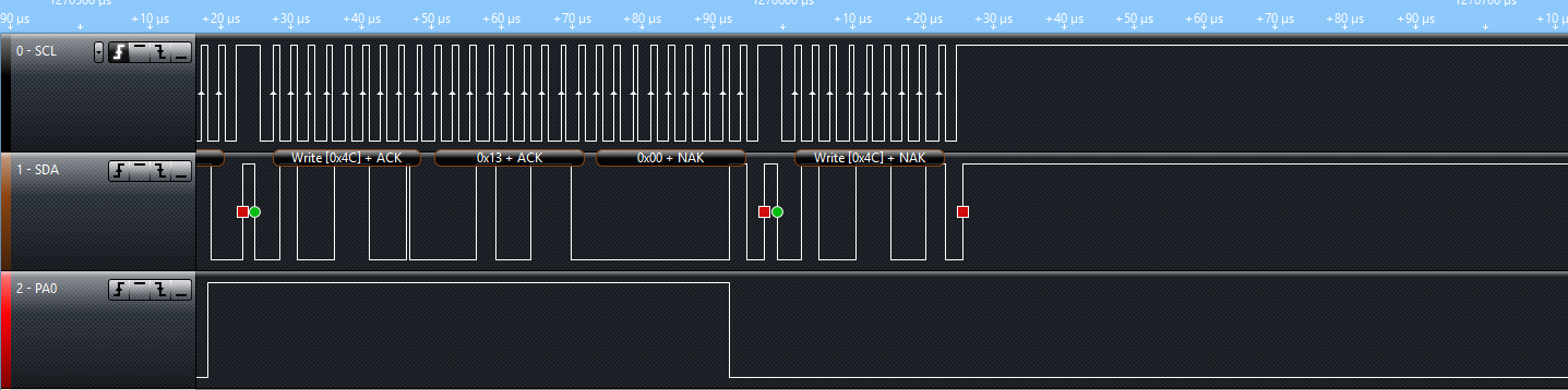 Ich habe ein Testprogramm für den MCP23017 geschrieben, welches den PortA auf 0x00 und dann auf 0xFF in einer Endlosschleife setzt. Mein Problem ist, wie in den angehängten Bildern zu sehen, dass nach ca 1 sec. der Expander kein ACK mehr zurücksendet. Woran kann das liegen?. Danke im Voraus!