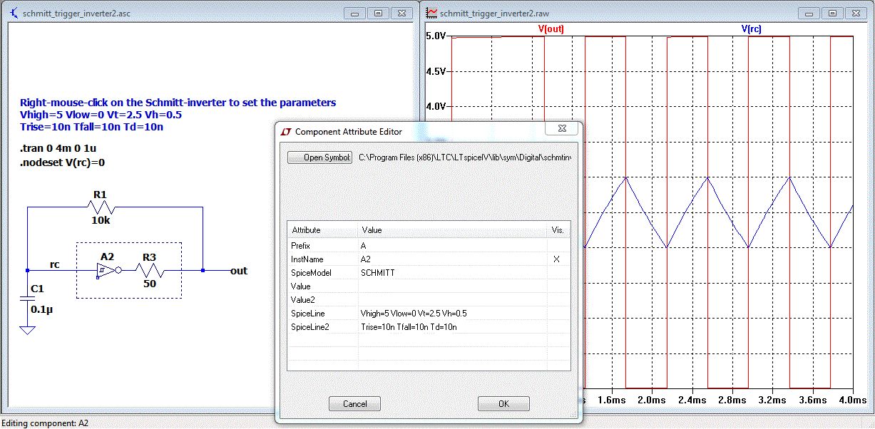 > ... selber machen. Danke für das schöne Beispiel :-) Da habe ich was gelernt. z.B. .nodeset V(rc)=0 Bis jetzt habe ich die "initial condition" des Kondensators mit rechte Maustaste -> IC=0 auf 0V gesetzt. Wie kann man ein eigenes Modell erstellen, so dass man den von Dir eingezeichneten 50Ohm Ausgangswiderstand in das Modell bekommt? >Ja. Die yahoo - LTSpice Group hat zumindest in einer LIB den 74HC14. Hier scheint es eine 74hcxx Lib zu geben: http://www.lns.cornell.edu/~ib38/teaching/p360/lectures/wk12/l35/11.1/74hc.lib