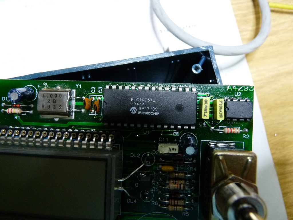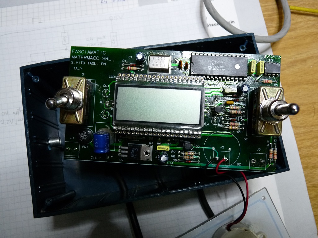 Die Diode an der Basis vom Transistor scheint IMHO im Schaltplan falsch rum zu sein und der Kondensator zwischen Kollektor und Emitter des Transistors ist auch etwas befremdlich. Kannst du das noch mal prüfen. Aus den Photos ist die Leiterbahnführung leider nicht so richtig ersichtlich. Und er 4k7 Widerstand liegt wirklich zwischen Kollektor des Transistors und Pin23 des Pic?