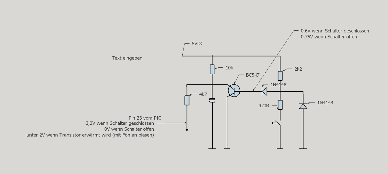 Nimm mal die 10k lieber wieder raus. Schlimmstenfalls ist das auf 3,2V dimensioniert worden, weil der PIC bei 3,3V läuft. Wäre erst einmal nicht soo schlimm, weil über die Schutzdioden die Differenz abgeführt wird. Ist aber nicht hübsch! Insgesamt aber etwas komische Schaltung mit den Dioden um den Transistor zu triggern. Aber ich würde auch deutlich unter 470 gehen. 100..220 sollten aber passen. Du kannst ja 470 du dem anderen dazulöten => ~ 230 Ohm. Allerdings frag ich mich auch wie jemand bei der Original-Schaltungm mit einem Teiler von 5V/(2k2+470)*470=0.88V rechnet? Da ist doch vorprogrammiert, dass spätesten bei höherer Temperatur der Transistor nicht mehr in die Sättigung geht. Mich überrascht es eh, dass es so schon funktioniert. Sicher, dass an dem Schalter nicht irgendwie eine negative Spannung angelegt wird oder so? Dann würde das mehr Sinn ergeben.