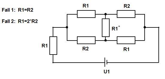 Hallo, mein Neffe hat mich um Hilfe gebeten. Habe ihm gesagt, dass im Fall 1 (alle Widerstände sind gleich groß) R1* keine Rolle spielt, da das Potential an beiden Anschlüssen identisch ist. Ist das richtig? Wie sieht es im Fall 2 (R1=2*R2) aus?