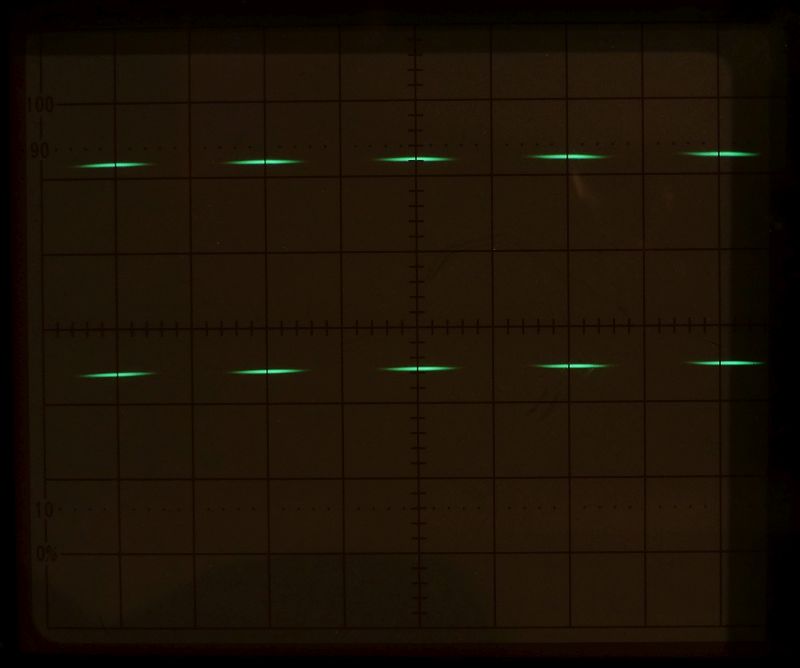 Hallo Leute! Beide Kanäle auf GND geschaltet, 10ms/div, Line-Trigger, Strahlhelligkeit recht weit runtergedreht. Wie man sieht, variiert die Helligkeit im 50Hz Takt. Wird die Helligkeit erhöht, wird der Effekt geringer und man sieht eine durchgezogene Linie. Das kann doch nicht norml sein? Mfg, Kurt