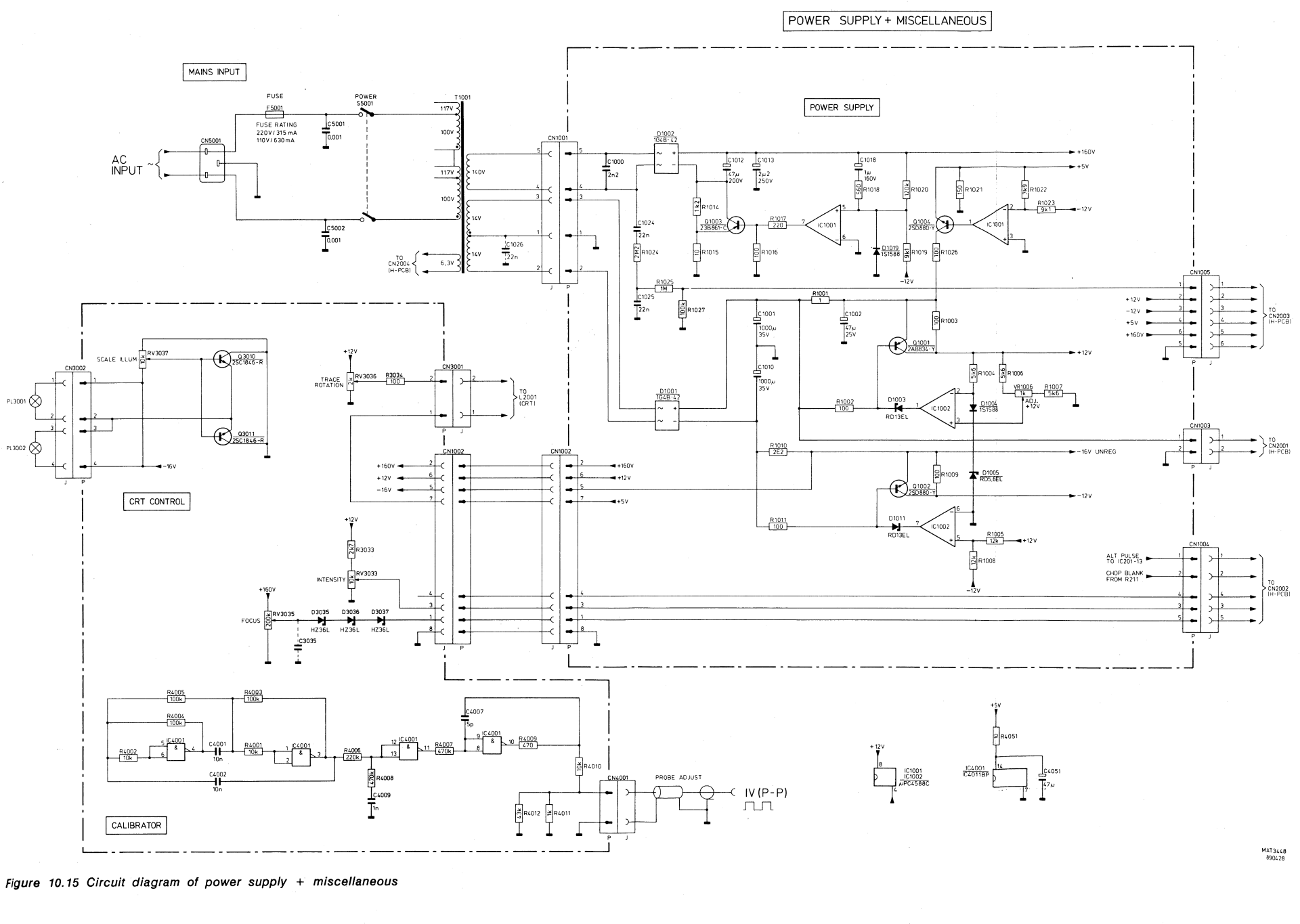 Servicemanual: http://bee.mif.pg.gda.pl/ciasteczkowypotwor/Philips/pm3208.pdf So einfach ist es leider nicht. Alle geregelten Spannungen haben einen Ripple im niedrigen mV Bereich. Die großen Elkos C1001, C1010 und C1012 im Netzteil haben einen ESR <0,1Ohm. Die Kathodenspannung beträgt -2,14kV, sollte aber "höchstens" -2,05kV haben. Aber auch da ist mit dem 40kV Tastkopf kein Ripple messbar. Mein 2,5kV Tastkopf ist kaputt, deshalb kann ich die hohen Spannungen nicht mit dem zweiten Oszi messen. Die ungeregelten 16V ripplen mit ca. 3Vpp. Ich denke das ist aber normal, da auch ein abblocken mit 1000µF Low ESR das Problem nicht bessert. Es deutet alles drauf hin, dass die Regelung der Kathodenspannung nicht arbeitet?