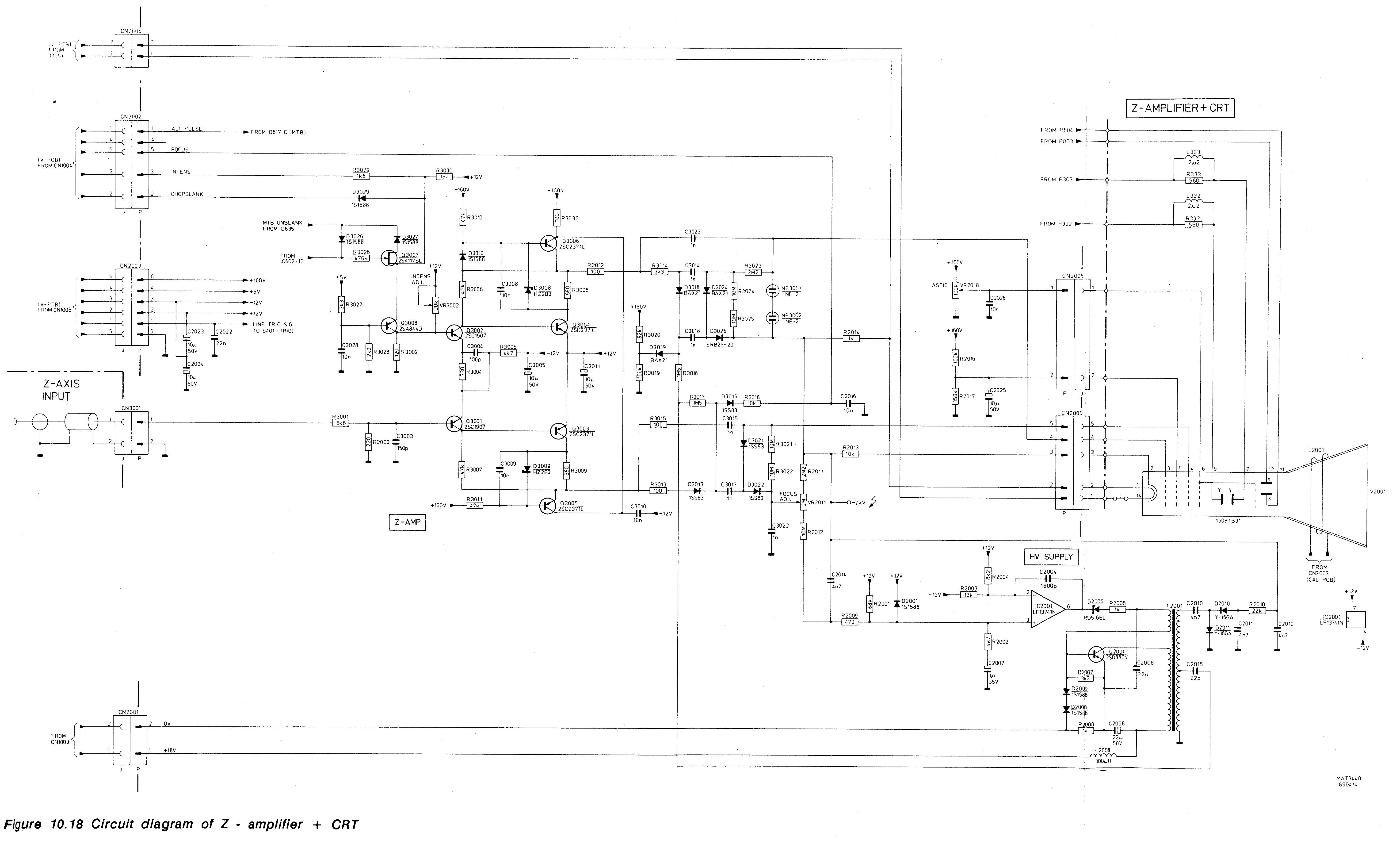 Dann scheint das störende Signal nicht aus dem HV-Regelkreis zu kommen. Folgender Test: Pins 2,3 an Röhre oder Pins 3,4 an CN 2005 mit einem Folienkondensator ca. 1µF verbinden. Dann wird geklärt, ob die Z-Modulation über die Helligkeitssteuerung hereinkommt. Da dabei auch die Rücklaufaustastung stillgelegt wird, Helligkeit vorsichtig von dunkel auf sichtbar hochstellen, es entsteht u.U. ein sehr heller Punkt am linken Bildrand. X-Verschiebung des Punkts nach links behebt dann die Gefahr, einen Punkt in den Schirm zu schweißen.