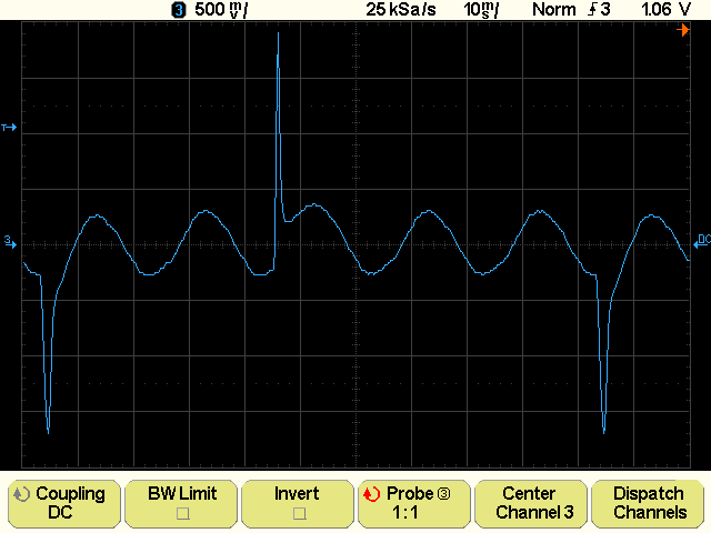 Es waren beides Folienkondensatoren. Das Bild zeigt das Line-Trigger Signal von CN2003 Pin 1 bei 10ms/div und nur einem aktiven Kanal. Weder an der Verbindung R3012/R3014 noch an R3013/3015 konnte ich einen 50Hz Anteil Messen.