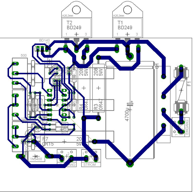 Hallo, Ich habe ein Layout (m)eines Netzteils fast fertig. Da sind nun natürlich die Leitungen die einen stärkeren Strom leiten müssen dicker als die des Regelkreises. Nun möchte ich gerne die unausgefüllten Flächen mit einem Polygon füllen. Die Abstände zu den Leiterbahnen sollten im Bereich des Regelkreises nicht sehr groß sein, damit einige Bahnen nicht frei in der Landschaft rumliegen(und beim ätzen dünner werden). Allerdings denke ich dass die dickeren Leiterbahnen auch gern einen breiteren Abstand hätten. Kann ich einfach im Bereich des Regelkreises ein Polygon mit geringerem Spacing machen und über alles eines mit großem Spacing? Wie groß sollte das Spacing bei den dicken Bahnen(max. 3A; reicht überhaupt die Dicke? Ich hatte mal ne Tabelle dazu find sie aber grad, wo ich sie mal brauch, natürlich nicht) sein? Auf was soll ich die Polygone legen? Es gibt da die Masse direkt nach dem Brückengleichrichter und die hinter R7(5W, unten links). Oder natürlich Vcc vor den Leistungstransistoren und dahinter. Jemand