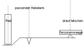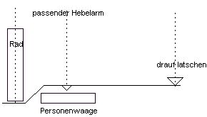 ...aua... Rechnen wir mal ein bisschen... geschätzte Radlast 800kg Personengewicht 80 kg Hebelarm 1: 25cm -> 800kg/80kg*25cm = 250cm Hebelarm 2 Die Personenwage schmeissen wir weg, denn wir wissen ja, dass wir 80kg wiegen... Wenn sich das Auto anhebt sind es 800 kg pro Rad. Wenn das Auto sich nicht anhebt, nehmen wir die Schwiegermutter: 1000kg pro Rad. Wenn 80 kg zu viel sind, nehmen wir die Gärtnerin: 500kg pro Rad. Hurra! Ich habe gerade die Hebelwaage erfunden! ;) Mirko