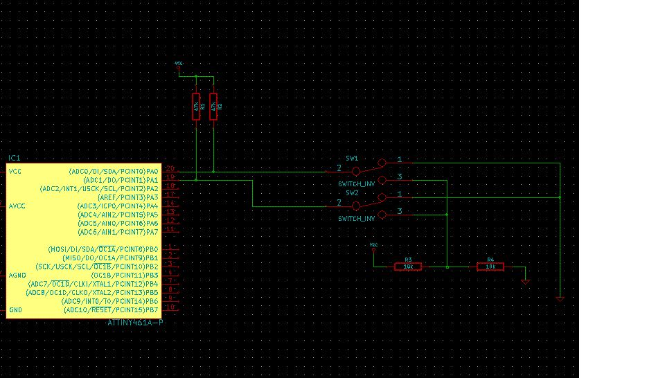Ich hab jetzt mal einen provisorischen Schaltplan gemalt. Die Schalter haben einen dritten Zustand (Schalter Mitte) wo nichts mit den ADC Pins verbunden ist. Da wirkt dann praktisch der Pullupwiderstand. Funktioniert das so?