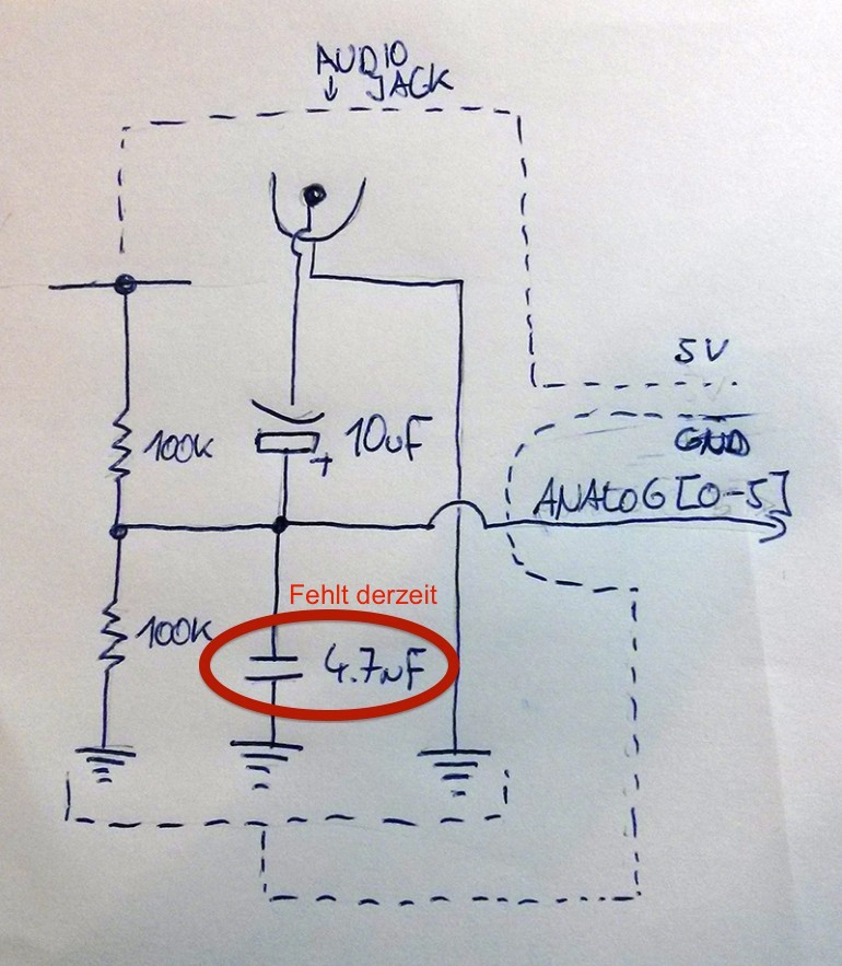 Hallo Leute, Ich habe mir in den letzten Wochen eine LED Matrix gelötet um einen Spectrum Analyzer zu basteln. An sich funktioniert das ganze auch schon so einigermaßen ( https://www.youtube.com/watch?v=WtPqNh6BMoo ). Mein Problem ist nun Folgendes: Das Audiosignal kommt über einen 3,5mm Klinkensplitter aus dem PC, an die angehängte Schaltung. Das Audiosignal wird vom Arduino richtig ausgewertet, aber der abgezweigte Kanal des Stereosignals ist dann tot und wird von der Anlage nichtmehr als Ton ausgegeben. Liegt das an der Schaltung bzw. dem derzeit fehlenden 4,7nF Kondensator (habe gerade keinen da) oder hat das einen anderen Grund? Vielen dank für die Hilfe. Gruß sebastian