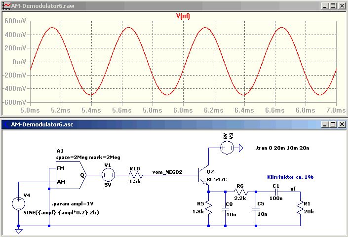 Der NE602 hat einen Differenzausgang, die beiden Pins können auch einzeln verwendet werden. Es ist ein Gleichspannungs-Anteil mit mehreren Volt überlagert, welcher als Vorspannung für einen AM-Demodulator dienen kann. Die Schaltung wird dadurch recht einfach und effektiv. Der zweite Ausgang kann für SSB-Signale oder für die AGC benutzt werden.