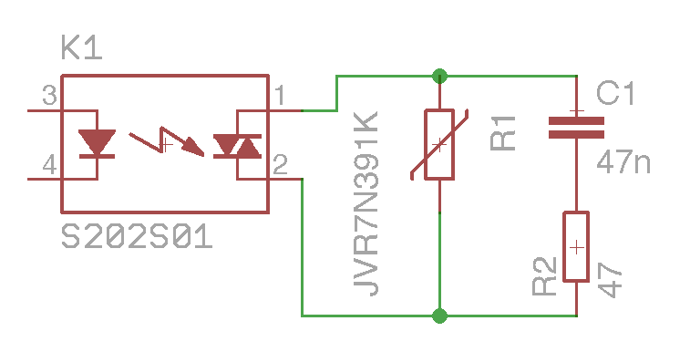 Bin auf der Suche nach einer Schutzschaltung für mein SSR. Eine 700W Pumpe soll gesteuert werden. Leider bin ich mir bei der Dimensionierung und den Bauteilen nicht ganz Sicher. Bauteile werden wie im Schaltplan gezeigt verschaltet. SSR wird ein S202S01. Keine Zero-Cross Erkennung wegen der Induktiven Last und des daraufhin großem Anlaufstrom? Snubber mit 47nF und 47Ohm habe ich von: http://www.sprut.de/electronic/ssr/ssr.htm Dort steht es als Startwert. Leider bin ich mir auch hier nicht sicher. Bauteile sollen sein: http://www.reichelt.de/MP3-X2-47N/3/index.html?&ACTION=3&LA=446&ARTICLE=32016&artnr=MP3-X2+47N&SEARCH=x2+kondensator http://www.reichelt.de/2W-METALL-47/3/index.html?&ACTION=3&LA=446&ARTICLE=2353&artnr=2W+METALL+47&SEARCH=2W+metall+47 Dazu noch einen Varistor: http://www.reichelt.de/VDR-0-25-250/3/index.html?&ACTION=3&LA=446&ARTICLE=22309&artnr=VDR-0%2C25+250&SEARCH=jvr7n391k Macht die Dimensionierung und die Bauteile so Sinn? Danke schon mal für die Hilfe. Bin bei 230V lieber ein bisschen vorsichtig. MfG Peter
