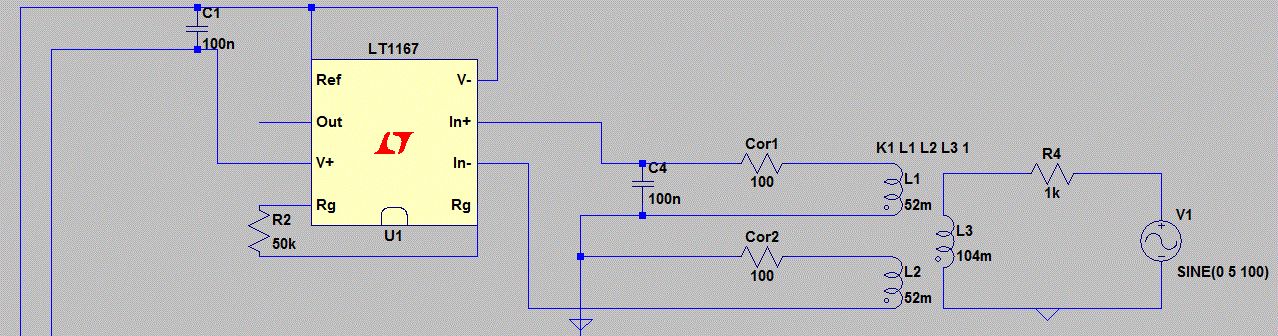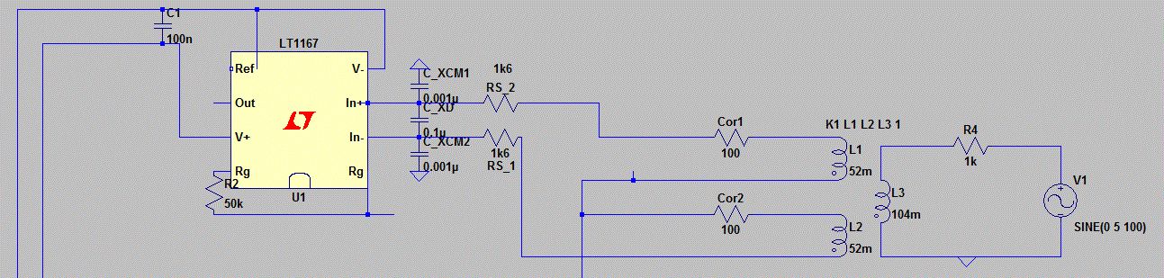 Hallo liebe Forumsgemeinde! Ich wende mich an euch mit einer Frage, die mir bei meiner Studienarbeit aufgekommen ist. Ich bin an einem Punkt angekommen an dem ich nicht so recht weiter weiß. Zu meinem Problem: Rechtsseitig werden über den Übertrager zwei gleichfrequente Signale eingespeist. Die Aufgabe die es zu bewältigen gilt ist auszusagen, ob diese wirklich gleich sind und wenn nicht, dies festzstellen. Also nur eine qualitative Aussage. Nun dachte ich mir, dass ich einen Instrumentationsverstärker dahinter schalten könnte und, falls die Frequenzen gleich sind, kommt bei OUT nichts raus. Wenn ich nun den Kondensator C4 hinzuschalte, wie im Bild gezeigt, verändert sich ja die Phasenlage der beiden Schwindungen zueinander und ich messe etwas, das von obigem abweicht. Ich betreibe den Instrumentationsverstärker asymmetrisch mit 0V und +5V. Leider verhält sich die gesamte Schaltung derart anders, dass ich nicht weiter weiß und euch um Hilfe bitte. Vielleicht habe ich auch ein prinzipielles Problem, was das Verständnis angeht, das kann sehr gut sein. Ich freue mich sehr auf euere Antworten! Grüße dark_one Der Link zum Datenblatt: http://cds.linear.com/docs/en/datasheet/1167fc.pdf