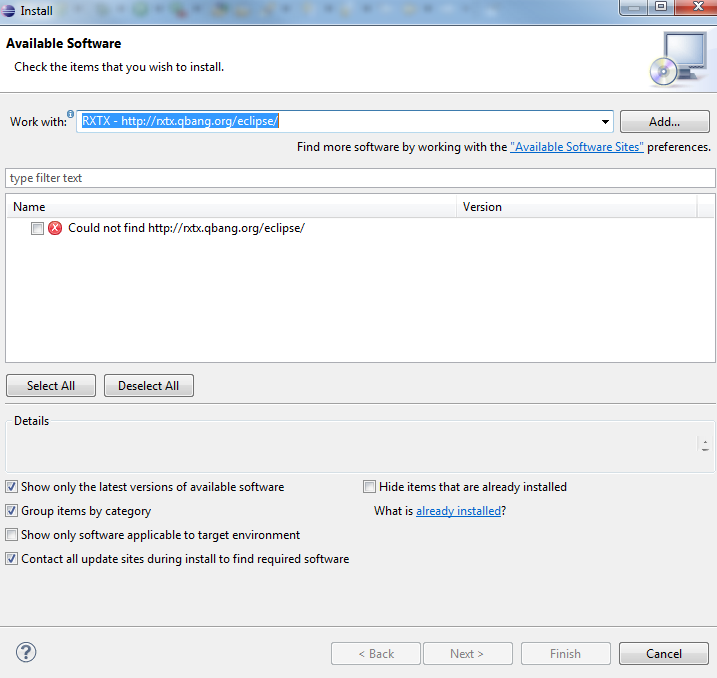 Hallo ich wollte gerade RXTX in Eclipse einbinden damit ich Daten im Terminal anzeigen lassen kann. Habe dazu eine Anleitung unter: http://armbedded.eu/node/210 jedoch funktioniert der dies nicht wie man auf dem angehängten Bild erkennt. Hat mir jemand einen Hinweis wie ich das ganze sonst noch einbinden kann? Verwende in Eclipse einen Arduino welchen ich Programmiere, das funktioniert alles auch soweit nur eben die serielle Ausgabe über das Terminal nicht.