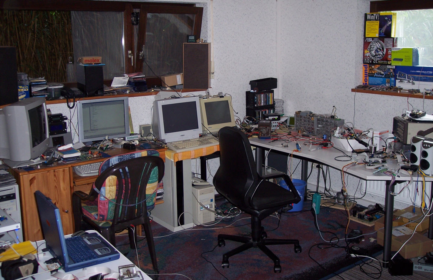 Hmm 4 PCs und Monitore + Laptop... nicht schlecht... Und da heisst es ich sei computerverrückt mit meinen zwei 19"ern aufm Schreibtisch... Okay den Serverschrank im Keller ned mitgerechnet... ;)