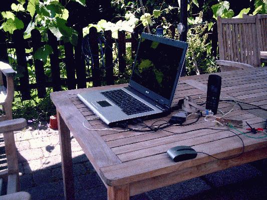 @Benedikt: Nette Werkstatt. Der in den Fensterrahmen geklemmte Lüfter gefällt. Was aber machen die beiden "Bananenbuchsen" nebst Kabel im Monoblock*? *) Plastikgartenstuhl, leider weltweit zu finden.