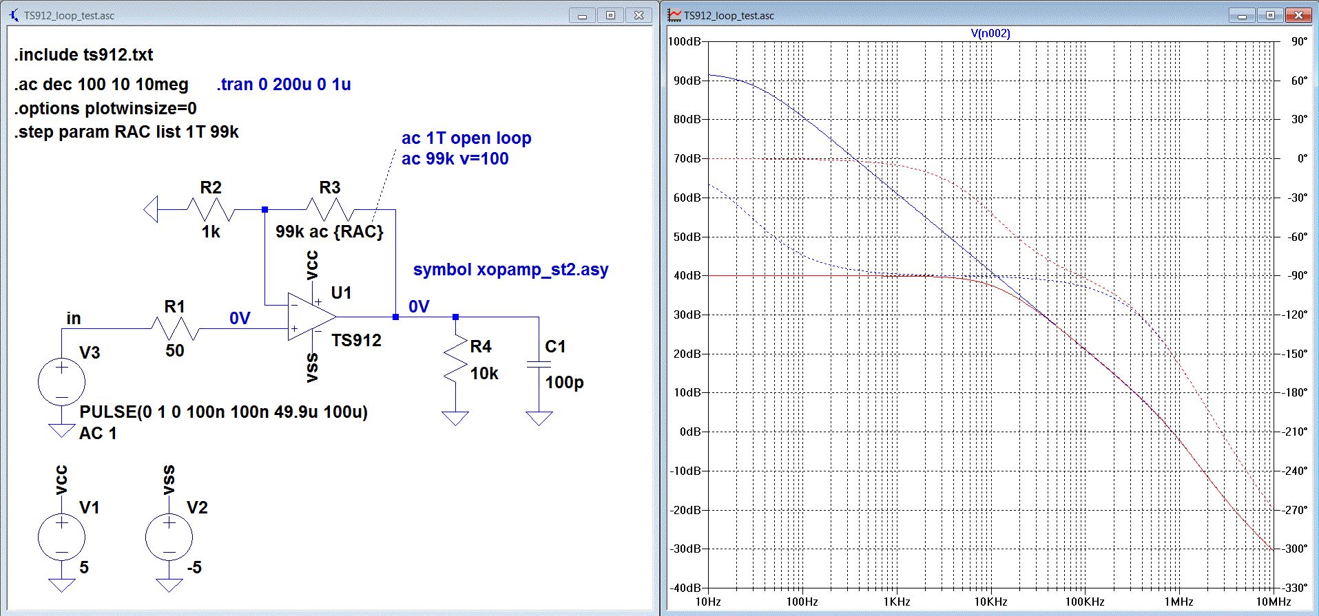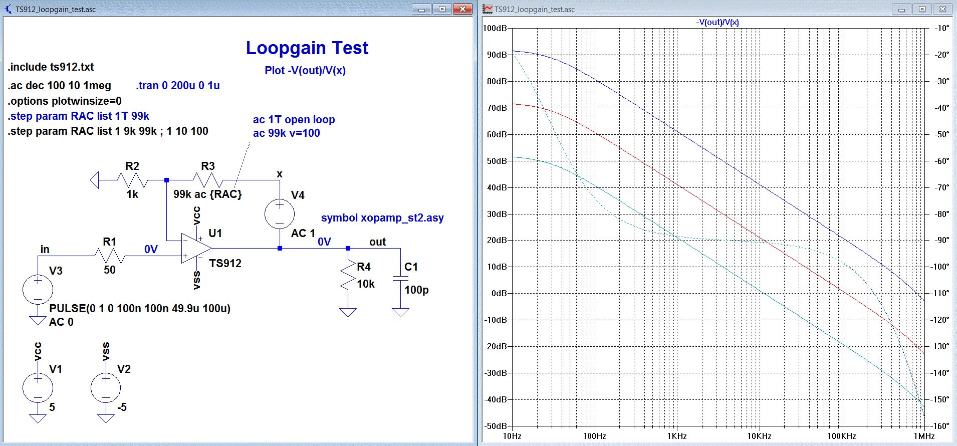 > 99k ac {RAC} Normalerweise hat der Widerstand 99kOhm in allen Analysearten von LTspice. Der Entwickler hat sich nun gedacht, dass es hilfreich wäre für die AC-Analyse den Wert unterschiedlich zu der Analyse für den Arbeitspunkt zu machen. Genau das macht diese Erweiterung. Beispiel: normal 10k, aber in der .AC Analyse 1000k 10k ac 1000k Die angehängte Datei und das Bild zeigen wie man die Loopgain-Analyse macht. Genau die ist gefragt, wenn es darum geht ob ein Verstärker stabil ist. Dazu muss bei 0dB die Phase betragsmäßig kleiner -180° sein. Die Differenz zu -180° ist die Phasenreserve. Beim TS912 sind das hier v=1 Phasenreserve 30° v=10 Phasenreserve 81° v=100 Phasenreserve 89° Man sieht sehr schön, dass eine große Verstärkung bei der Phasenreserve hilft.