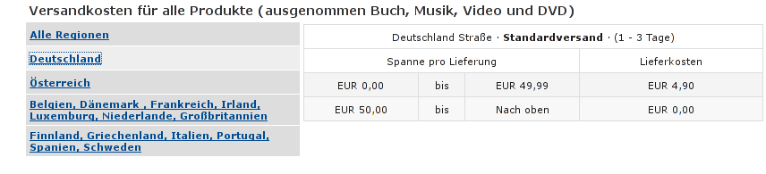 Immer noch besser als der Versand nach Österreich Da sucht man sich mühsam Artikel zusammen und beim Abschicken der Bestellung steht dann "kein Versand nach Österreich", als ob die das nicht früher prüfen könnten. Dazu kommt noch der Ärger mit der österr. Leermedien Abgabe, sodass von MP3Player bis Kameras und CDs vieles nicht mehr lieferbar ist. Außer die User Bewertungen hat Amazon für mich keinen Mehrwert mehr. Aber gut, lieber die Leermedienabgabe und dafür legale Privatkopie :)