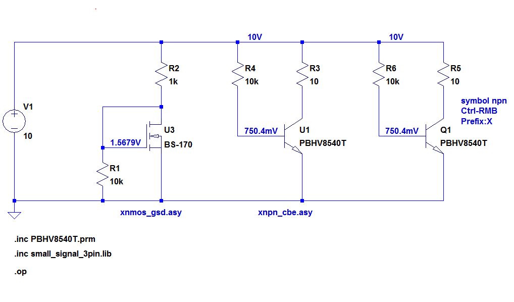 1. Aus der Infineon Datei habe ich nur die 3pin Modelle extrahiert. Für die 5pin Modelle braucht man ein 5pin Symbol. Die habe ich aber auch schon mal hier hoch geladen. Die 5pin Modelle von Infineon sind bezüglich Konvergenz eine Riesenproblem. Dazu verkneife ich ich mir jeden Kommentar. 2. Für die NXP Transistoren braucht man ein Symbol für ein Subcircuit. Entweder man platziert ein npn und modifiziert ihn im Schaltplan zum Subcircuit oder man nimmt ein Subcircuit-Symbol (Prefix:X). Mach einen Design-Ordner, z. B. C:\Meine_Schaltungen\Schaltung1. Da entpackst du den zip-file und lässt alle Dateien dort. Du sollst nichts in das Installationsverzeichnis kopieren, weil kein anderer deinen "Müll" Im Installationsordner haben will nur um deine Schaltungen zu simulieren. Leider zu spät um noch einen Roman zu schreiben. Gruß Helmut Nachtrag: Hab das Beispiel mit den 5pin-Symbolen gefunden. Beitrag "Infineon PMOS in LTSpice einbinden, bitte um Hilfe"