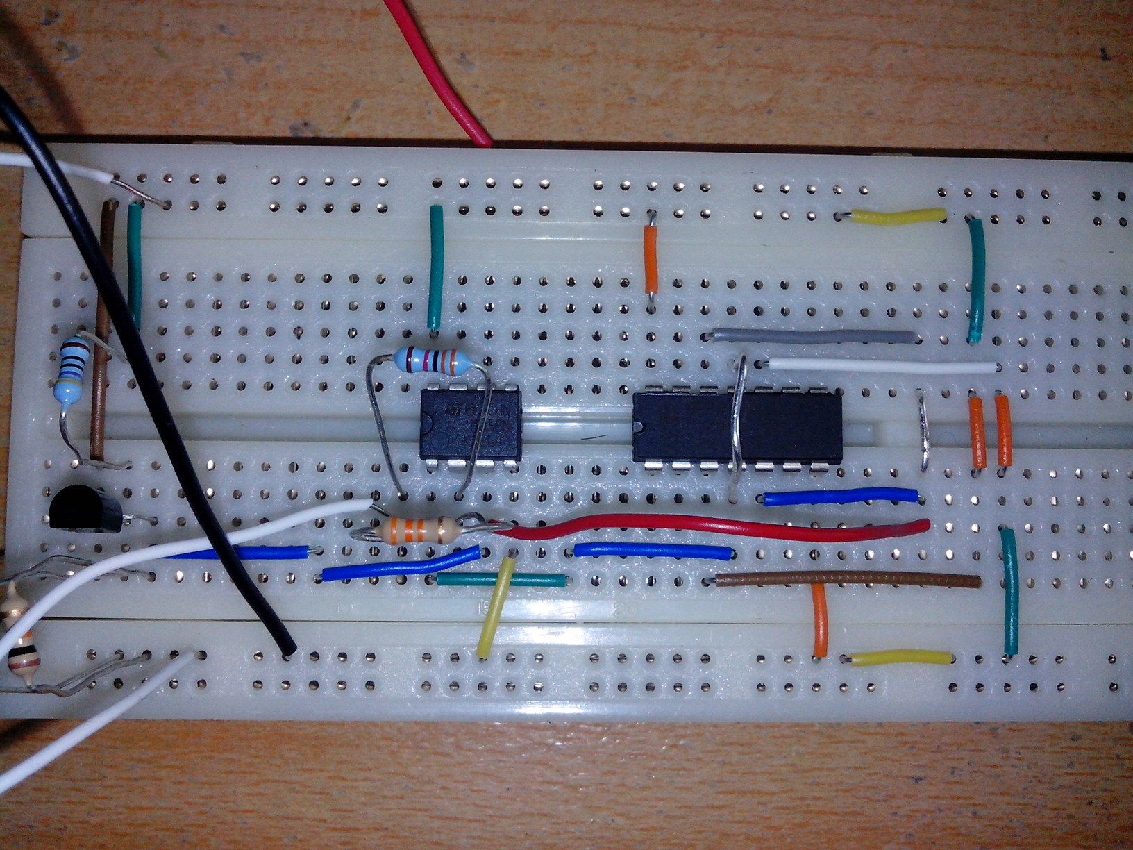 Hallo zusammen. Ich bin momentan wirklich am verzweifeln und hoffe das mir hier als letzte Anlaufstelle geholfen werden kann :) Und zwar muss ich für meine Elektronik-Vorlesung eine Schaltung mit Transmission-Gate aufbauen und für verschiedene Zustände den Ausgangsstrom angeben. Die Schaltung dafür befindet sich im Anhang. Für den ersten Fall, soll ich am Knoten Nr.5 eine Spannung von Referenzspannung (4.5V) + 2.5V mit dem Poti einstellen (also 7V). Dann soll ich das Gate vom N-Kanal Transistor (M1) auf VDD legen und das Gate vom P-Kanal Transistor (M2) auf Masse bzw Vss. Gesagt getan, anbei noch das Datenblatt (http://www.eletrica.ufpr.br/ufpr2/professor/36/TE215/CD4007.pdf) für den MOS-FET Baustein und ein Bild meines Aufbaus (eine alte + neue Version da ich es neu aufgebaut hatte um Fehler zu vermeiden). Jetzt ging es also ans Messen... Erste Schwierigkeit: Die 7V am Punkt 5 genau einzustellen, da er dank der Rückkopplung ab bestimmten Punkten springt. (Ich hatte es auch 1x ohne die Rückkoplung gemacht was keinen großen Unterschied im Ausgangsstrom verursacht hatte). Als ich circa die 7V dran hatte, hab ich die Kopplung weggenommen und dann mein Multimeter dazwischen geschaltet um den Strom, der durch beide MOS-FETs geht, zu messen. Als Ergebnis erhielt ich bei Transmission1 0.71mA und bei Transmission2, 0.3mA. Jetzt sollte ich noch abwechselnd den N- oder P-Kanal MOS-FET ausschalten um zu messen von wem welcher Anteil zum Strom kommt. Hier kam, wie auch erwartet, raus, dass der Strom überwiegend durch den P-Kanal Transistor (M2) fließt, da hier ja eine "hohe" negative Gate-Source-Spannung anliegt. Und beim N-Kanal Transistor eine eher geringes positives VGS was diesen in Richtung Sperrzustand bringt. Soweit so gut und auch alles wie vermutet. Jetzt soll ich allerdings das gleiche wiederholen, allerdings mit einer Spannung von Referenz - 2.5V (also 2V) am Punkt 5. Die Spannung also wieder mit dem Poti genau eingestellt und an Punkt 6 wieder mit dem Multimeter den Strom, der durch beide Transistoren fließt, gemessen. Hier ergab sich jetzt ein Wert von 12mA. 2mA fallen am P-Kanal FET ab und 10mA am N-Kanal. Das der Strom jetzt etwas größer sein sollte, da der Widerstand des N-Kanals sich natürlich nicht symetrisch mit dem des P-Kanals verhält, hatte ich vermutet. Allerdings erscheint mir 12mA doch schon ziemlich hoch im Vergleich zu den 0.7mA von der ersten Messung (mal abgesehen davon, dass der Strom nicht konstant bleibt wenn ich am Poti drehe was ebenfalls anders als bei Messung aus 1 um die 7V rum ist). Und weiterhin wundert mich auch das am P-Kanal die 2mA fließen obwohl dieser ja quasi gesperrt sein sollte. Deswegen jetzt meine Frage: Können die Werte so stimmen oder gehe ich recht der Annahme, dass irgendetwas nicht richtig funktioniert? Ich wäre wirklich sehr dankbar wenn mir jemand bei diesen Problem helfen könnte :) mfg Bobba p.s. Bitte nicht auf irgendwelche Artikel zur Funktion von MOS-FETs oder Transmission-Gate verlinken...ich hab schon einige Seiten durchwühlt und kann es mir immernoch nicht erklären :(