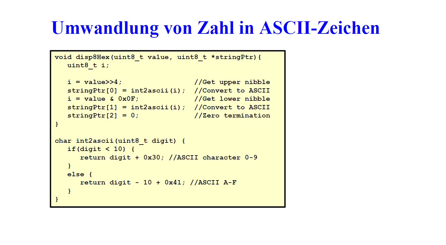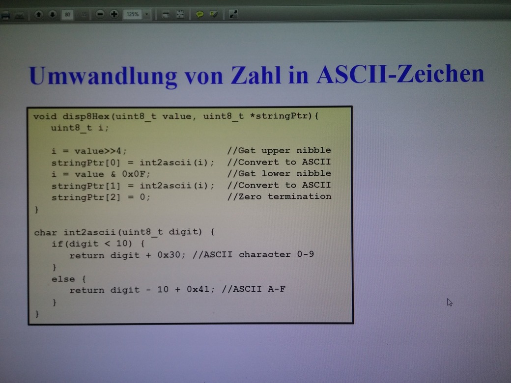 DirkB, ich habe im ascii nachgeschaut, und was in int2ascii steht, verstehe ich auch. Aber schau, da ist ein achtstelliger code im value. So danach verschiebe ich um vier stellen nach rechts und bekomme den oberen nibble. Danach konvertiere ich in ascii und wird in index 0 reingeschrieben, aber beim ausgeben erscheint dieser nicht. Das ist das eine. Danach gehe ich weiter, und was passiert bei "i=value&0x0F" verstehe ich nicht
