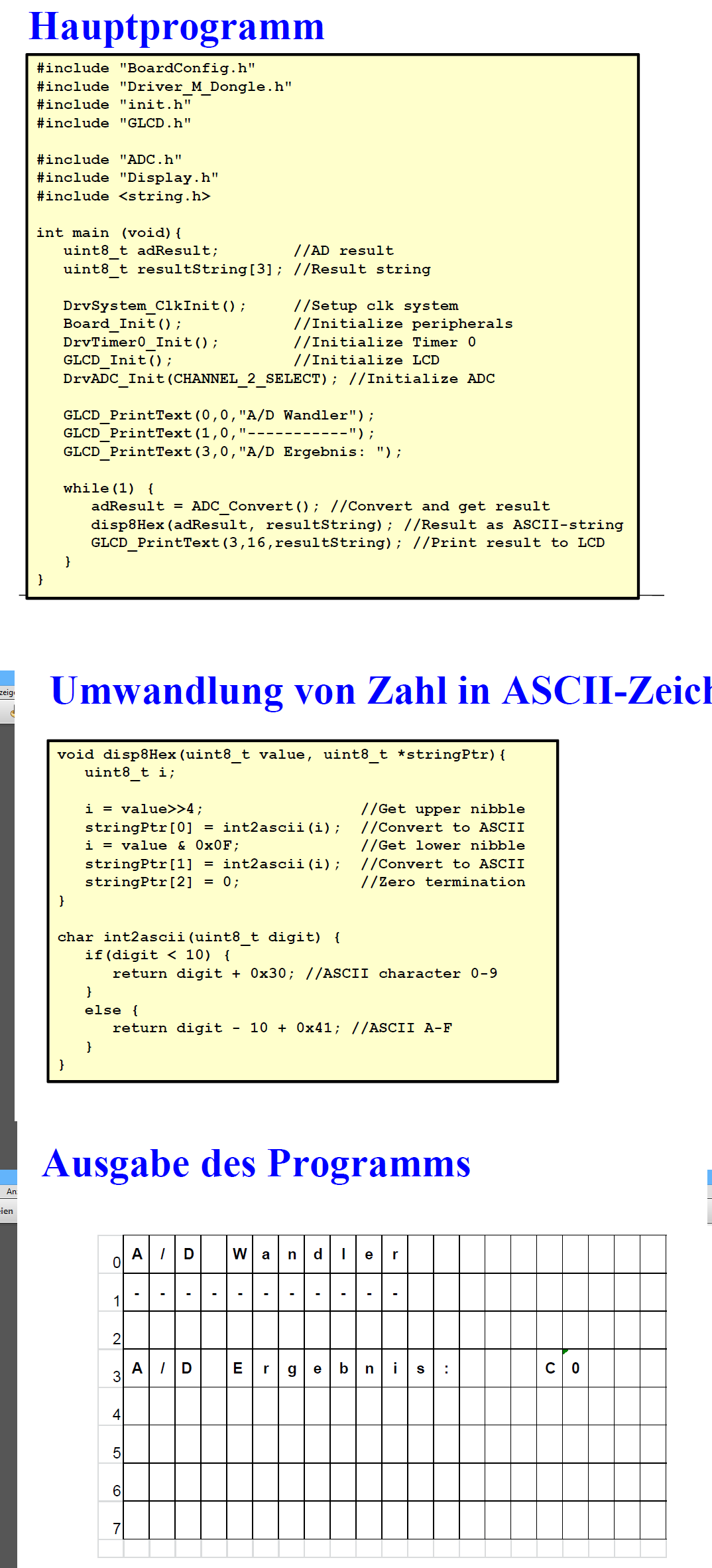Hallo allen, wie schon im betreff gesagt, ich verstehe diese Funktion nicht, oder eher gesagt, ich verstehe diese teilweise. Auf dem lcd soll dann dieser wert rauskommen: C0. Kann mir bitte jemand erklaeren, wie dieser wert zu stande kommt. Weil vor der "C" mus es ja noch irgend ein wert geben, und wie es dann mit dem lower nibble funktioniert, ich kopiere es einfach nicht. Kann mir bitte jemand helfen?
